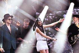 "Это лето фестиваль 2025" в саду "Эрмитаж". Участники электро-поп-дуэта Nemiga Влад Соболев и Karina Pill во время выступления.