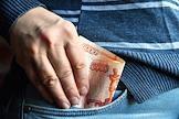 Жанровая фотография. Рублевые купюры достоинством 5 тысяч рублей в кармане брюк.