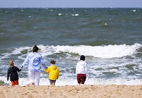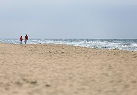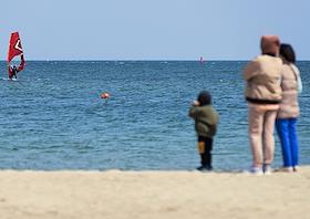 Виды пляжей Калининградской области перед началом купального (туристического) сезона. Жанровая фотография. Отдыхающие на пляже города Пионерский.