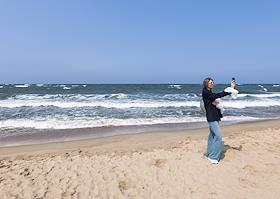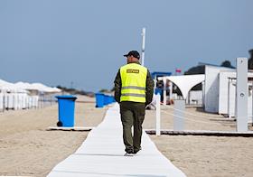Виды пляжей Калининградской области перед началом купального (туристического) сезона. Жанровая фотография. Сотрудник охраны на пляже города Пионерский.