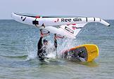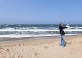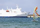 Виды пляжей Калининградской области перед началом купального (туристического) сезона. Жанровая фотография. Виндсерфингист на фоне грузопассажирского парома "Антей".