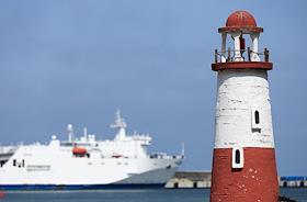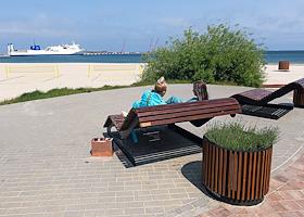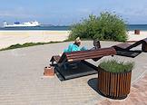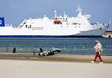 Виды пляжей Калининградской области перед началом купального (туристического) сезона. Жанровая фотография. Отдыхающие на пляже города Пионерский. Грузопассажирский паром "Антей".