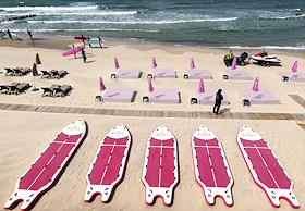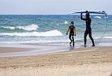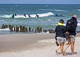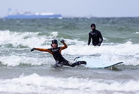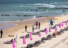 Виды пляжей Калининградской области перед началом купального (туристического) сезона. Жанровая фотография. Серфингисты на пляже Зеленоградска.