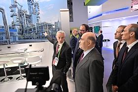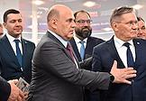 Рабочая поездка председателя правительства России Михаила Мишустина в Нижний Новгород. Выставка "Цифровая индустрия промышленной России" (ЦИПР) в рамках X конференции цифровых технологий "ЦИПР-2025" в выставочном центре "Нижегородская ярмарка". Председатель правительства России Михаил Мишустин (в центре) во время посещения выставки.