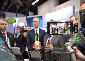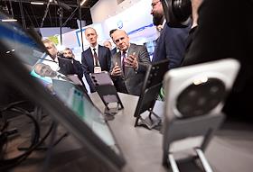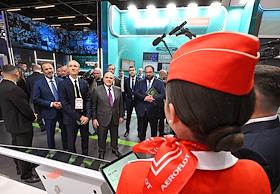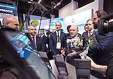 Рабочая поездка председателя правительства России Михаила Мишустина в Нижний Новгород. Выставка "Цифровая индустрия промышленной России" (ЦИПР) в рамках X конференции цифровых технологий "ЦИПР-2025" в выставочном центре "Нижегородская ярмарка". Председатель правительства России Михаил Мишустин (на экране камеры) во время посещения выставки.