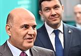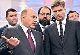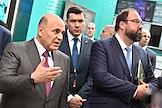 Рабочая поездка председателя правительства России Михаила Мишустина в Нижний Новгород. Выставка "Цифровая индустрия промышленной России" (ЦИПР) в рамках X конференции цифровых технологий "ЦИПР-2025" в выставочном центре "Нижегородская ярмарка". Председатель правительства России Михаил Мишустин (слева) и министр цифрового развития, связи и массовых коммуникаций России Максут Шадаев (справа) и во время посещения выставки.