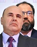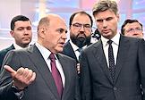 Рабочая поездка председателя правительства России Михаила Мишустина в Нижний Новгород. Выставка "Цифровая индустрия промышленной России" (ЦИПР) в рамках X конференции цифровых технологий "ЦИПР-2025" в выставочном центре "Нижегородская ярмарка". Председатель правительства России Михаил Мишустин (справа) и заместитель председателя правительства России - глава аппарата правительства России Дмитрий Григоренко (слева) во время посещения выставки.