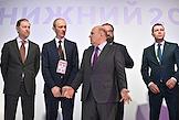 Рабочая поездка председателя правительства России Михаила Мишустина в Нижний Новгород. Выставка "Цифровая индустрия промышленной России" (ЦИПР) в рамках X конференции цифровых технологий "ЦИПР-2025" в выставочном центре "Нижегородская ярмарка". Справа налево: губернатор Нижегородской области Глеб Никитин, председатель правительства России Михаил Мишустин, заместитель председателя правительства России - глава аппарата правительства России Дмитрий Григоренко и первый заместитель председателя правительства России Денис Мантуров во время посещения выставки.