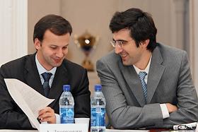 Начальник Экспертного Управления Администрации Президента России Аркадий Дворкович (слева) и чемпион мира по шахматам Владимир Крамник (справа) на пресс-конференции в Центральном Доме шахматиста имени Ботвинника.