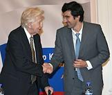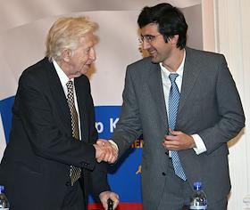 Международный гроссмейстер Василий Смыслов (слева) на пресс-конференции чемпиона мира Владимира Крамника (справа) в Центральном Доме шахматиста имени Ботвинника.