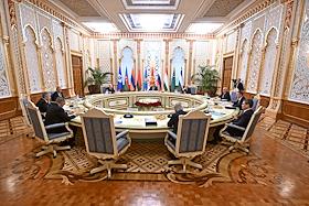Рабочая поездка председателя правительства России Михаила Мишустина в Душанбе. Заседание Совета глав правительств Содружества Независимых Государств (СНГ). Премьер-министр Таджикистана Кохир Расулзода (в центре) во время заседания.