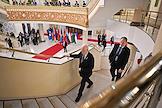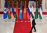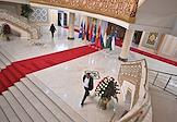 Заседание Совета глав правительств Содружества Независимых Государств (СНГ) в Государственной резиденции "Кохи Сомон" (Дворец Саманидов). Жанровая фотография. Флаги государств-участников в фойе Государственной резиденции.
