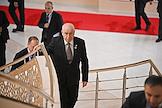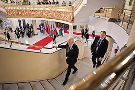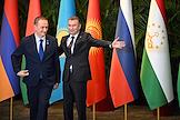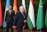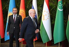 Рабочая поездка председателя правительства России Михаила Мишустина в Душанбе. Заседание Совета глав правительств Содружества Независимых Государств (СНГ). Генеральный секретарь СНГ Сергей Лебедев (слева) перед началом церемонии совместного фотографирования участников заседания.