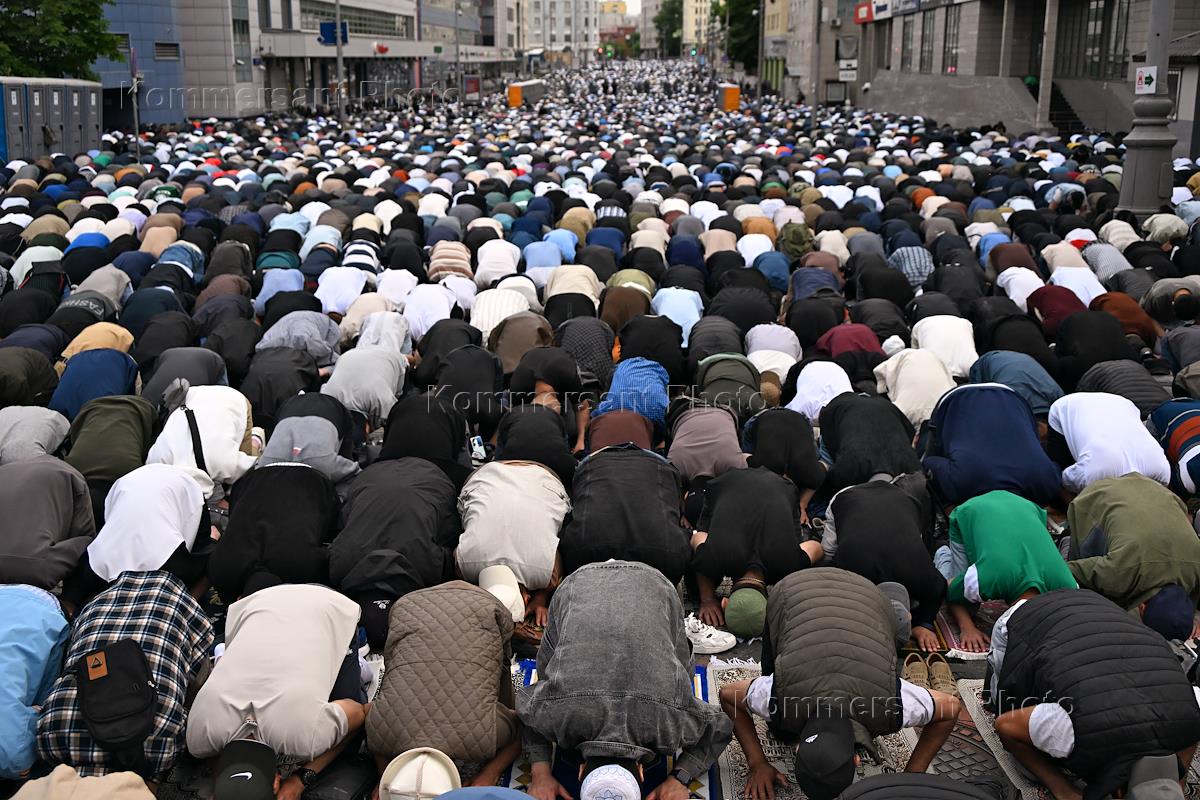 Праздник жертвоприношения Курбан-Байрам в Московской Соборной мечети. Верующие во время праздничного богослужения.
