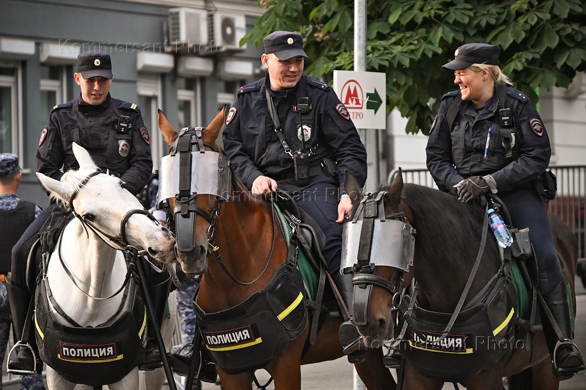 Праздник жертвоприношения Курбан-Байрам в Московской Соборной мечети. Жанровая фотография. Сотрудники конной полиции во время дежурства возле мечети.