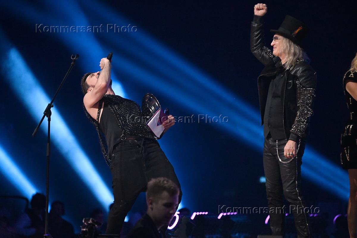 The annual national television award in the field of popular music "MUZ-TV Award 2025. LEGEND" in the Live Arena concert hall. Soloist of the group "Room of Culture" Zhenya Trofimov (left) at the ceremony.