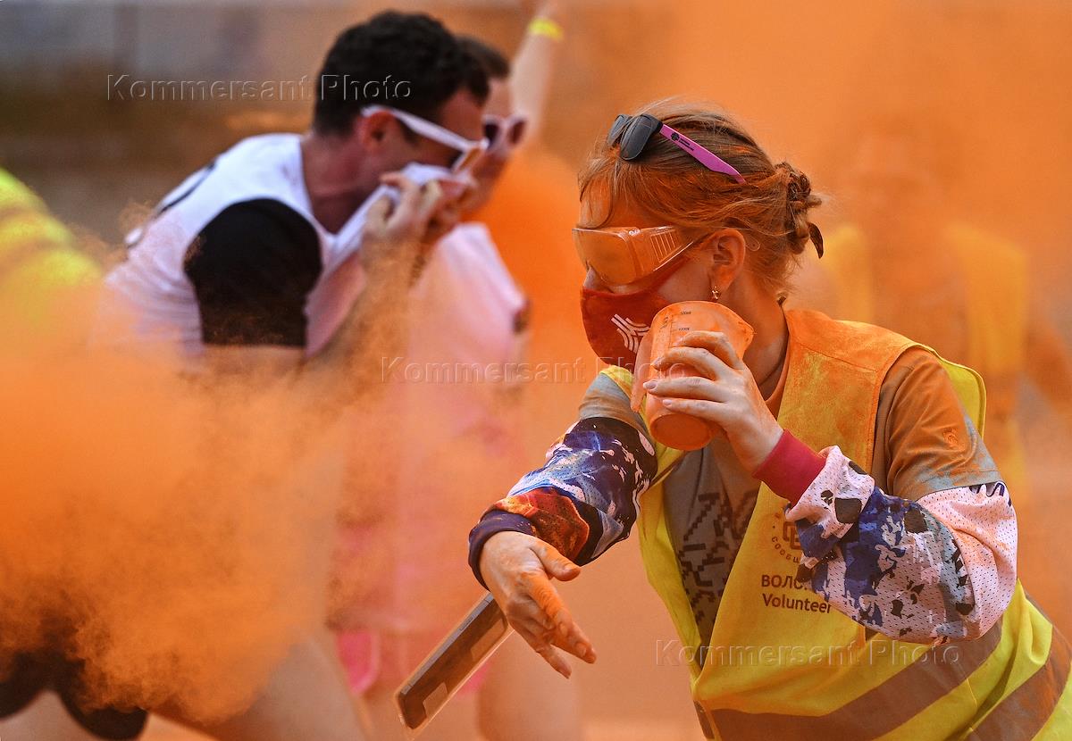 "Красочный забег" на территории Олимпийского комплекса "Лужники". Участники во время забега. Жанровая фотография.