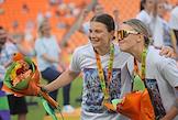 Winline Суперкубок России по футболу среди женских команд 2025. Финал. Матч между командами "Локомотив" (Москва) и "Зенит" (Санкт-Петербург) на стадионе "Екатеринбург Арена". Игроки команды "Зенит" Анастасия Поздеева (слева) и Екатерина Пантюхина (справа) во время церемонии награждения.