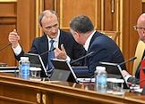 Заседание правительства России. Министр России по делам гражданской обороны, чрезвычайным ситуациям и ликвидации последствий стихийных бедствий (МЧС) Александр Куренков (слева) и заместитель председателя правительства России Дмитрий Патрушев (справа) во время заседания.