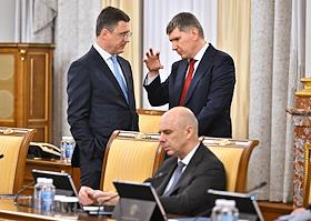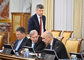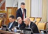 Заседание правительства России. Слева направо: заместитель председателя правительства Александр Новак, министр экономического развития России Максим Решетников и министр финансов России Антон Силуанов во время заседания.