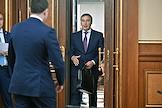 Заседание правительства России. Заместитель председателя правительства России - глава аппарата правительства России Дмитрий Григоренко (слева) и заместитель председателя правительства России Марат Хуснуллин (справа) во время заседания.