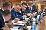 Заседание правительства России. Слева направо: заместитель председателя правительства России - глава аппарата правительства России Дмитрий Григоренко, заместитель председателя правительства России Марат Хуснуллин, министр экономического развития России Максим Решетников, заместители председателя правительства России Александр Новак и Виталий Савельев во время заседания.