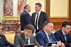 Заседание правительства России. Министр России по делам гражданской обороны, чрезвычайным ситуациям и ликвидации последствий стихийных бедствий (МЧС) Александр Куренков (слева) и министр труда и социальной защиты России Антон Котяков (справа) перед началом заседания.