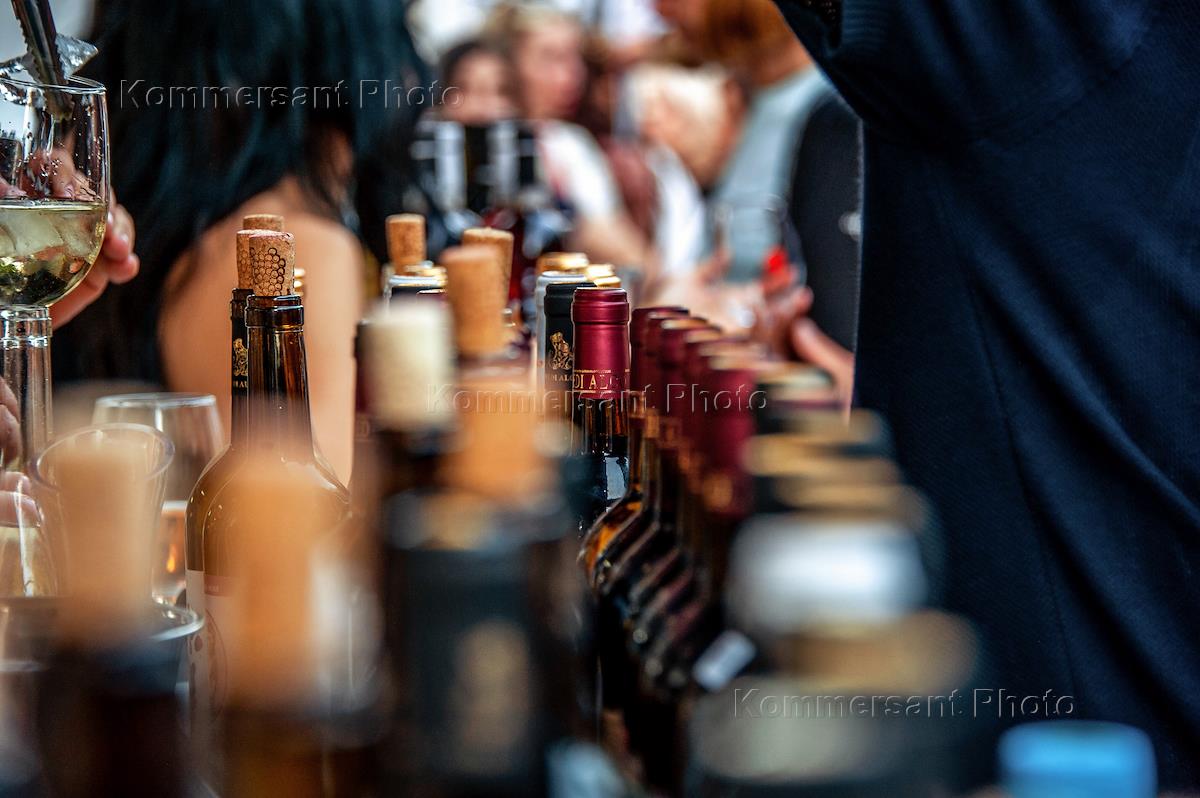 Фестиваль "Дни вина в Ереване". Жанровая фотография. Бутылки с вином на столе.