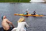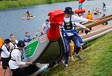 XVIII Петровский гребной марафон в рамках празднования дня рождения Петра I. Участники марафона на финишной трассе у Петропавловской крепости. Жанровая фотография.