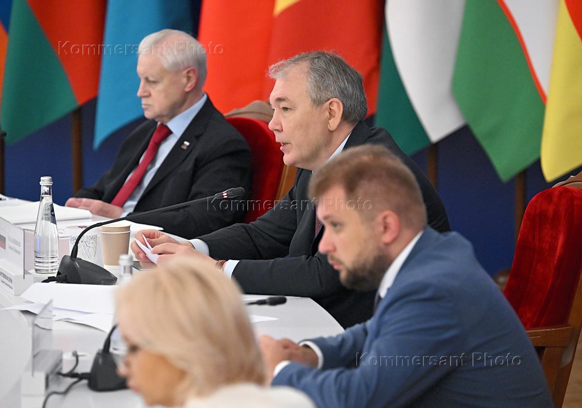 Пленарное заседание Третьего Международного парламентского Форума Союза Независимых Государств (СНГ) "Пушкинские чтения" в Колонном зале Дома Союзов. Слева направо: председатель партии "Справедливая Россия – За Правду", руководитель фракции "Справедливая Россия – За Правду" в Государственной думе (ГД) России Сергей Миронов, председатель комитета ГД России по делам СНГ, евразийской интеграции и связям с соотечественниками Леонид Калашников и заместитель председателя ГД России Борис Чернышов во время заседания.