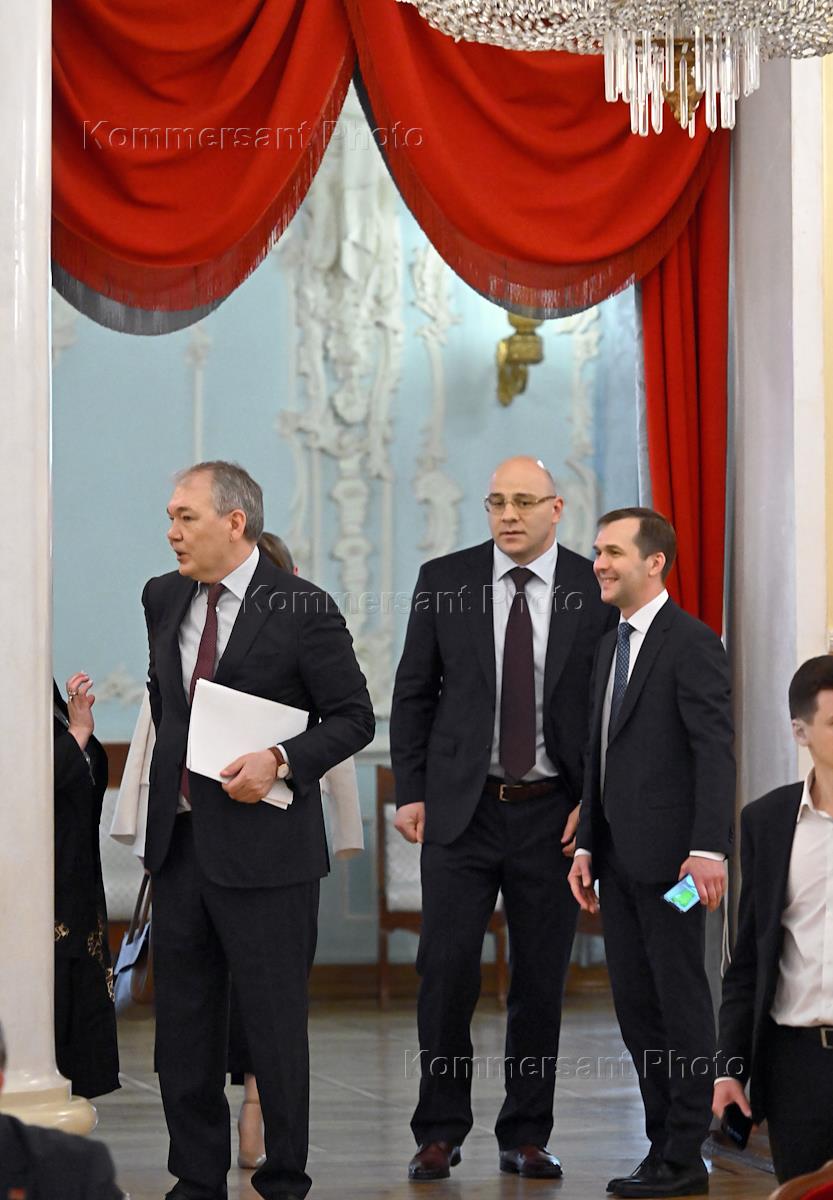 Пленарное заседание Третьего Международного парламентского Форума Союза Независимых Государств (СНГ) "Пушкинские чтения" в Колонном зале Дома Союзов. Слева направо: член комитета Государственной думы (ГД) России по экологии, природным ресурсам и охране окружающей среды Артур Таймазов, заместитель председателя комитета ГД России по физической культуре и спорту Сергей Бурлаков и председатель комитета ГД России по обороне Андрей Картаполов перед началом заседания.