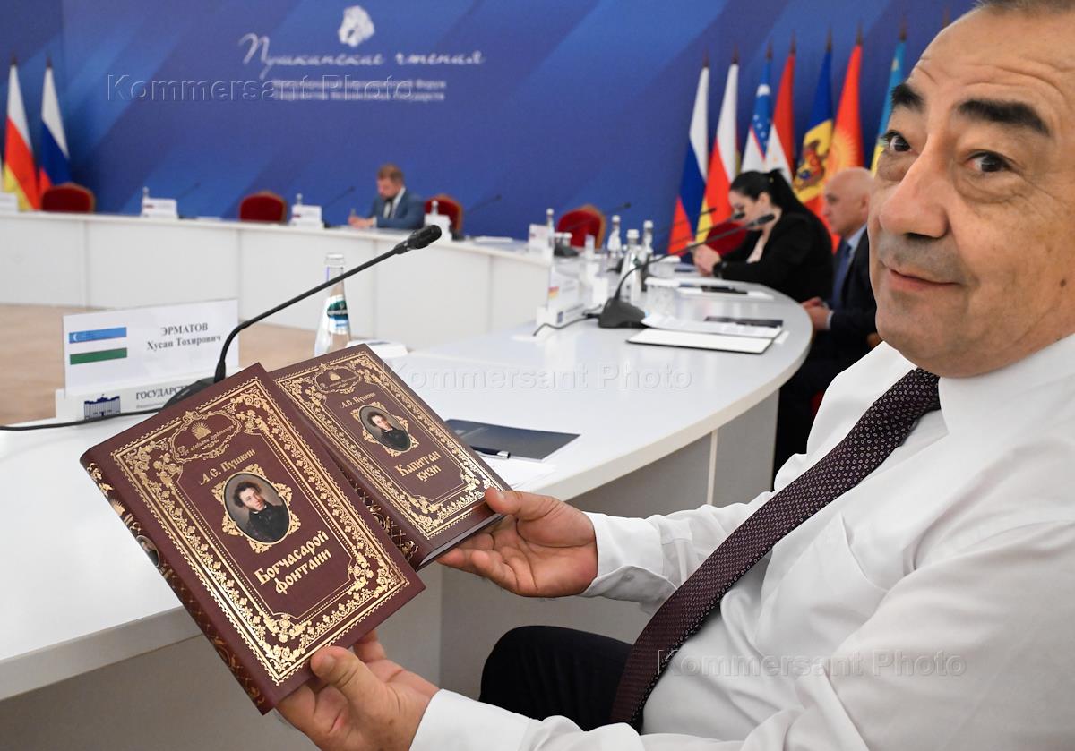 Пленарное заседание Третьего Международного парламентского Форума Союза Независимых Государств (СНГ) "Пушкинские чтения" в Колонном зале Дома Союзов. Жанровая фотография. Двухтомник Александра Пушкин на узбекском языке.