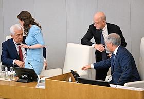 Пленарное заседание Государственной думы (ГД) России. Слева направо: член комитета ГД России по промышленности и торговле Ярослав Самылин, член комитета ГД России по науке и высшему образованию Ольга Пилипенко, член комитета ГД России по международным делам Роза Чемерис и Василькова Мария, член комитета ГД России по промышленности и торговле Роза Чемерис и член комитета ГД России по промышленности и торговле Мария Василькова во время заседания.
