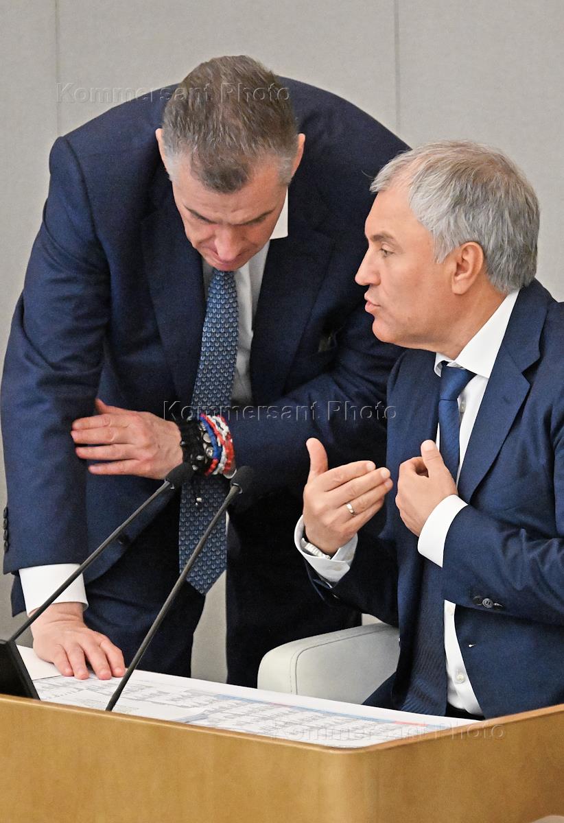 Пленарное заседание Государственной думы (ГД) России. Председатель комитета ГД России по бюджету и налогам Андрей Макаров (слева) и председатель ГД России Вячеслав Володин (справа) во время заседания.