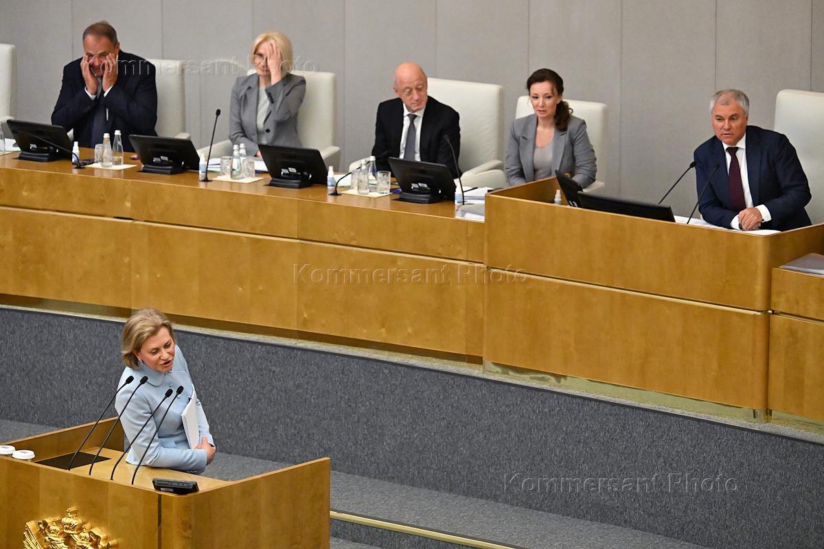 Пленарное заседание Государственной думы (ГД) России. Руководитель Федеральной службы по надзору в сфере защиты прав потребителей и благополучия человека - главный государственный санитарный врач России Анна Попова во время заседания.