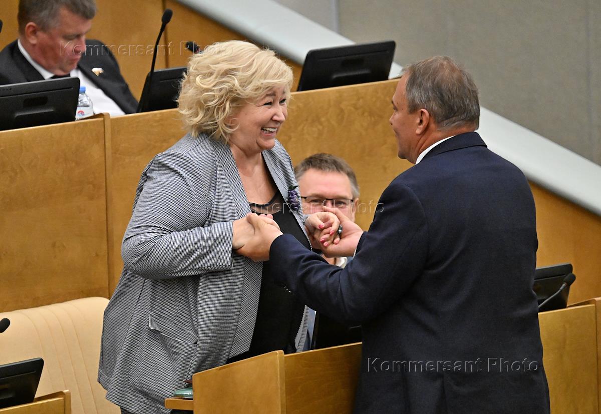 Пленарное заседание Государственной думы (ГД) России. Заместитель председателя комитета ГД России по защите семьи, вопросам отцовства, материнства и детства Елена Вторыгина (слева) и заместитель председателя ГД России Петр Толстой (справа) во время заседания.
