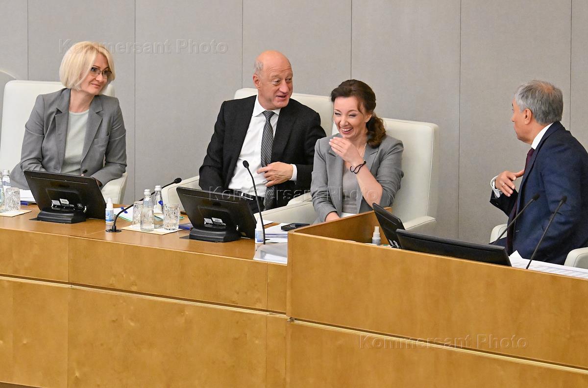 Пленарное заседание Государственной думы (ГД) России. Слева направо: министр здравоохранения России Михаил Мурашко, заместители председателя ГД России Виктория Абрамченко, Александр Бабаков, Анна Кузнецова и председатель ГД России Вячеслав Володин во время заседания.