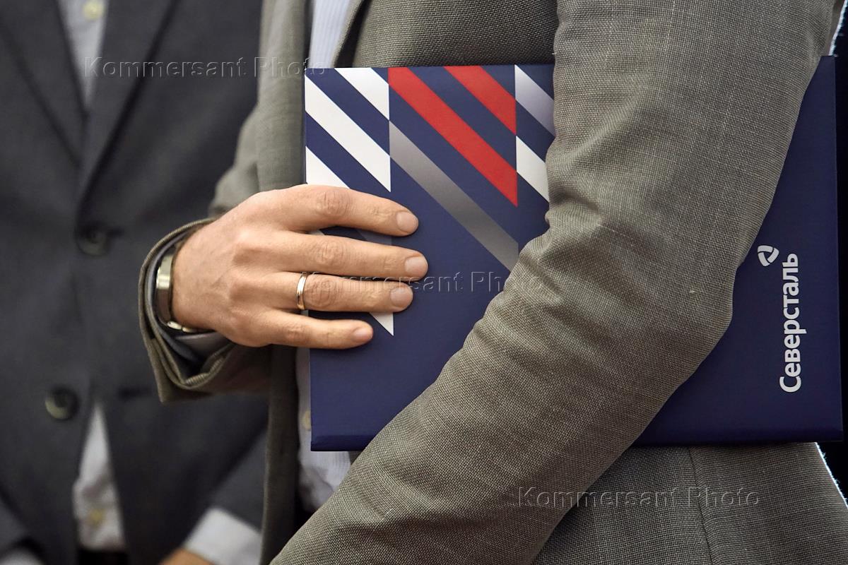 Пресс-конференция, посвященная Фестивалю мирового балета "Benois de la Danse–2025", в пресс-центре Государственного академического Большого театра. Папка с надписью "Северсталь" в руках советника генерального директора по устойчивому развитию ПАО "Северсталь" Захара Азарова.