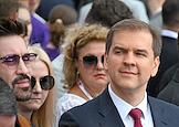 Торжественная церемония запуска часов обратного отсчета "100 дней до "Интервидения’25" на Манежной площади. Певец Дима Билан (справа) и заместитель министра иностранных дел России Александр Панкин (второй слева) на церемонии.
