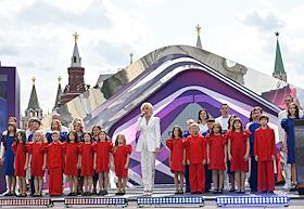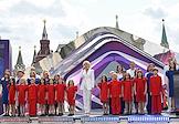 Торжественная церемония запуска часов обратного отсчета "100 дней до "Интервидения’25" на Манежной площади. Певица Валерия (в центре) во время выступления на церемонии.
