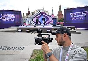 Торжественная церемония запуска часов обратного отсчета "100 дней до "Интервидения’25" на Манежной площади. Жанровая фотография. Работа телеоператора на церемонии.