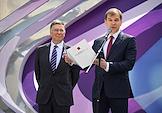 Торжественная церемония запуска часов обратного отсчета "100 дней до "Интервидения’25" на Манежной площади. Заместитель министра иностранных дел России Александр Панкин (слева) и начальник Управления президента России по общественным проектам Сергей Новиков (справа) на церемонии.