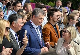 Торжественная церемония запуска часов обратного отсчета "100 дней до "Интервидения’25" на Манежной площади. Зрители на церемонии.