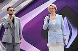 Торжественная церемония запуска часов обратного отсчета "100 дней до "Интервидения’25" на Манежной площади. Продюсер Яна Рудковская (слева) и певец Дима Билан (в центре) на церемонии.