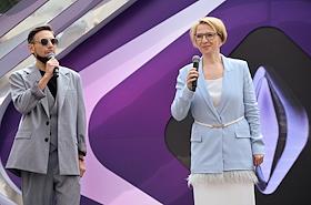 Торжественная церемония запуска часов обратного отсчета "100 дней до "Интервидения’25" на Манежной площади. Телеведущие Андрей Разыграев (слева) и Яна Чурикова (справа) на церемонии.