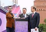 Торжественная церемония запуска часов обратного отсчета "100 дней до "Интервидения’25" на Манежной площади. Слева направо: телеведущий Андрей Разыграев, певец Дима Билан и телеведущая Яна Чурикова на церемонии.