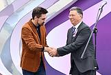 Торжественная церемония запуска часов обратного отсчета "100 дней до "Интервидения’25" на Манежной площади. Певец Дима Билан (слева) и заместитель министра иностранных дел России Александр Панкин (справа) на церемонии.
