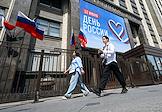 Жанровая фотография. Праздничный плакат, посвященный Дню России, на фасаде здания Государственной думы России на Охотном ряду.