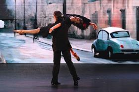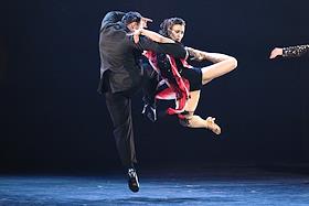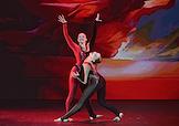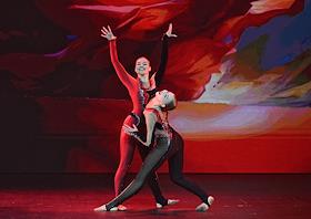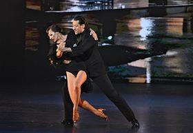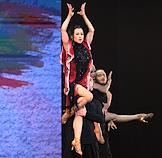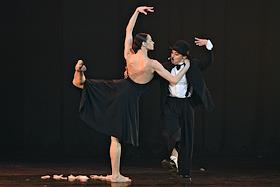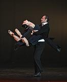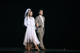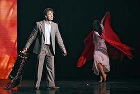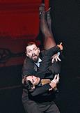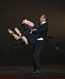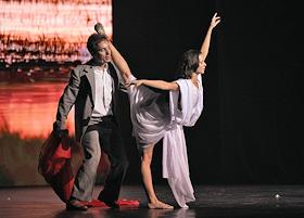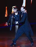 Премьера пластического спектакля "Наваждение" в концертном зале "Москва" (парк "Остров мечты"). Художественный руководитель и продюсер спектакля тренер по художественной гимнастике Ирина Винер, режиссер - Зарина Мухитдинова. Актер Игорь Неведров (слева) и гимнастка Екатерина Селезнева (справа) на премьере.