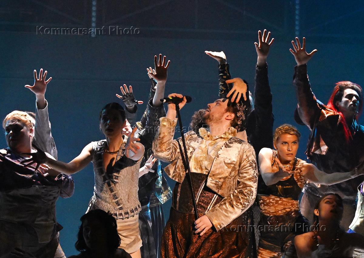 Пресс-показ спектакля "Лисистрата" по мотивам пьесы Аристофана на сцене Государственного Московского Еврейского театра "Шалом" в постановке художественного руководителя театра Олега Липовецкого. Актер Антон Ксенев во время спектакля.